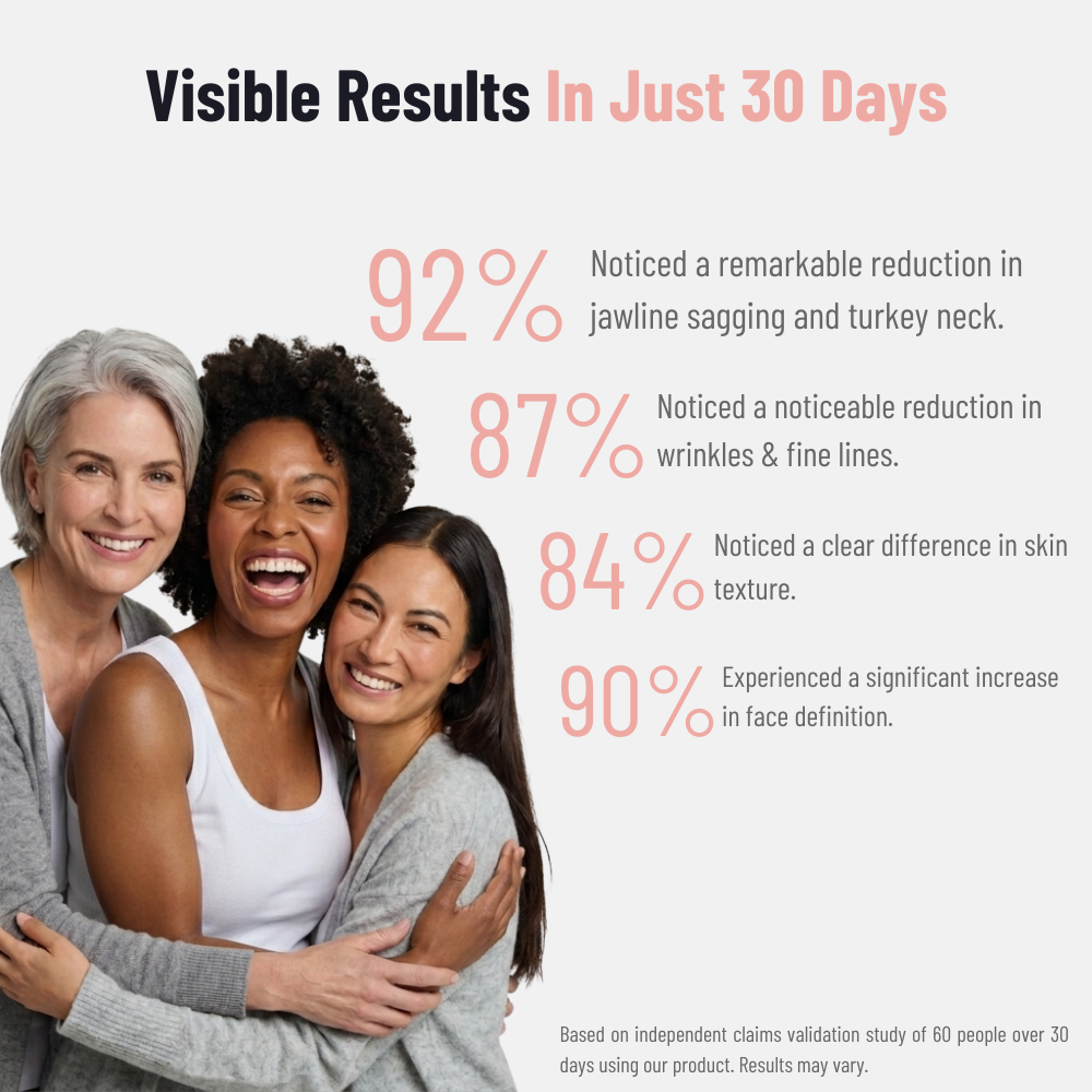Most users start noticing visible improvements, like firmer skin, a lifted appearance, and a healthy glow, within 3 to 4 weeks of consistent use.