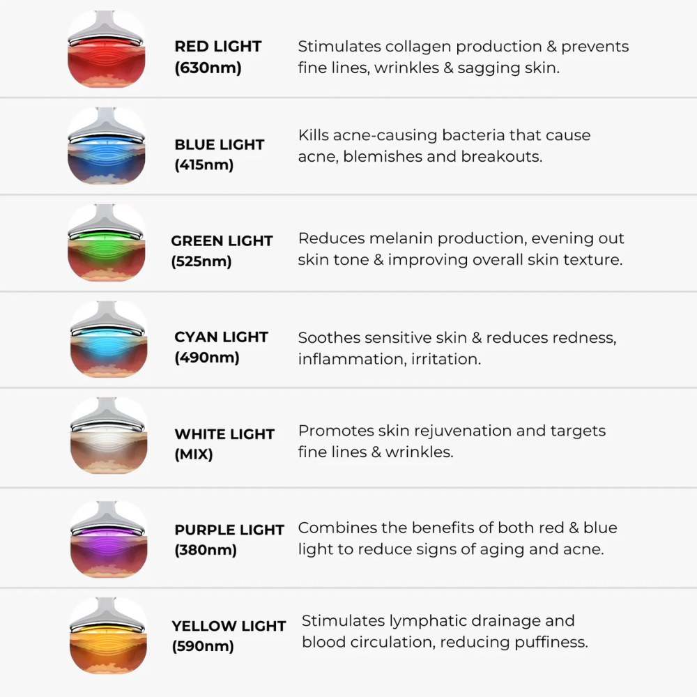 You can switch between 7 LED light settings, each focused on different skin concerns like texture, breakouts, and fine lines.