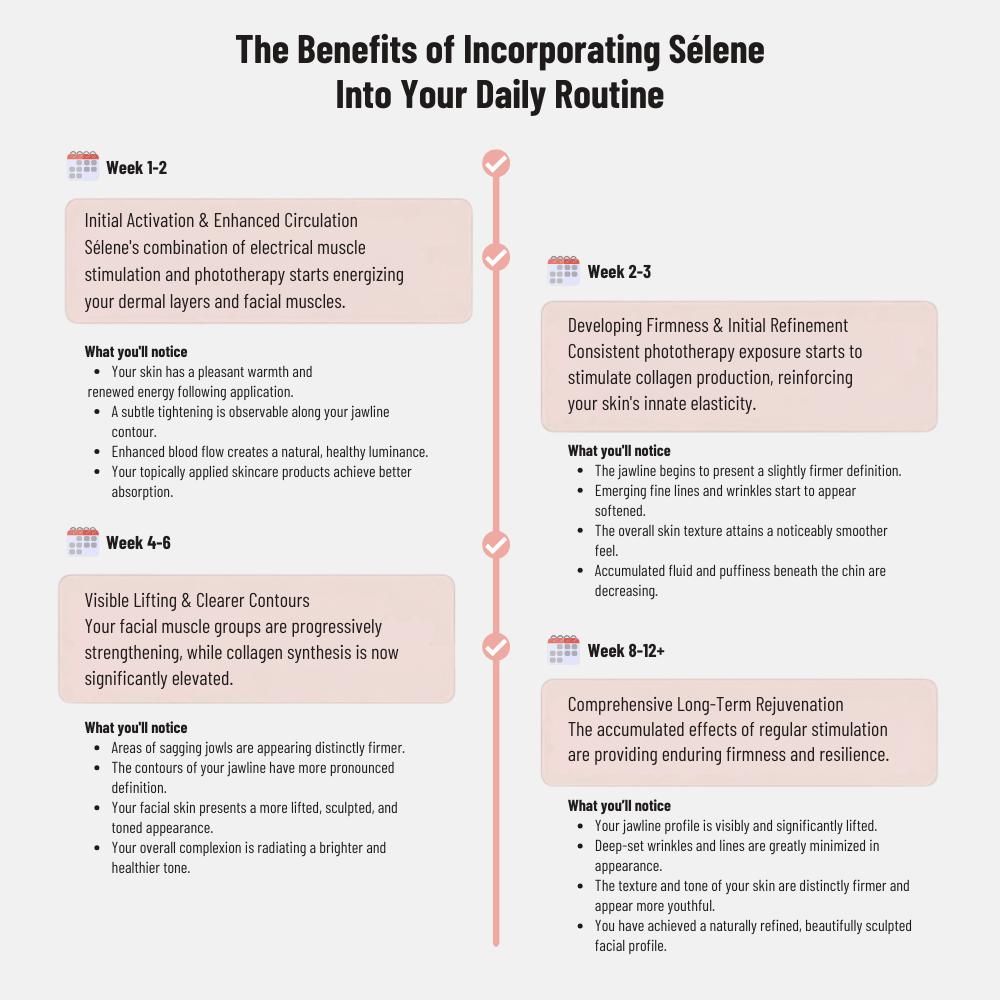 For best results, use the Sélene Facial Sculptor for 5 - 10 minutes per session, 5-7 times a week.